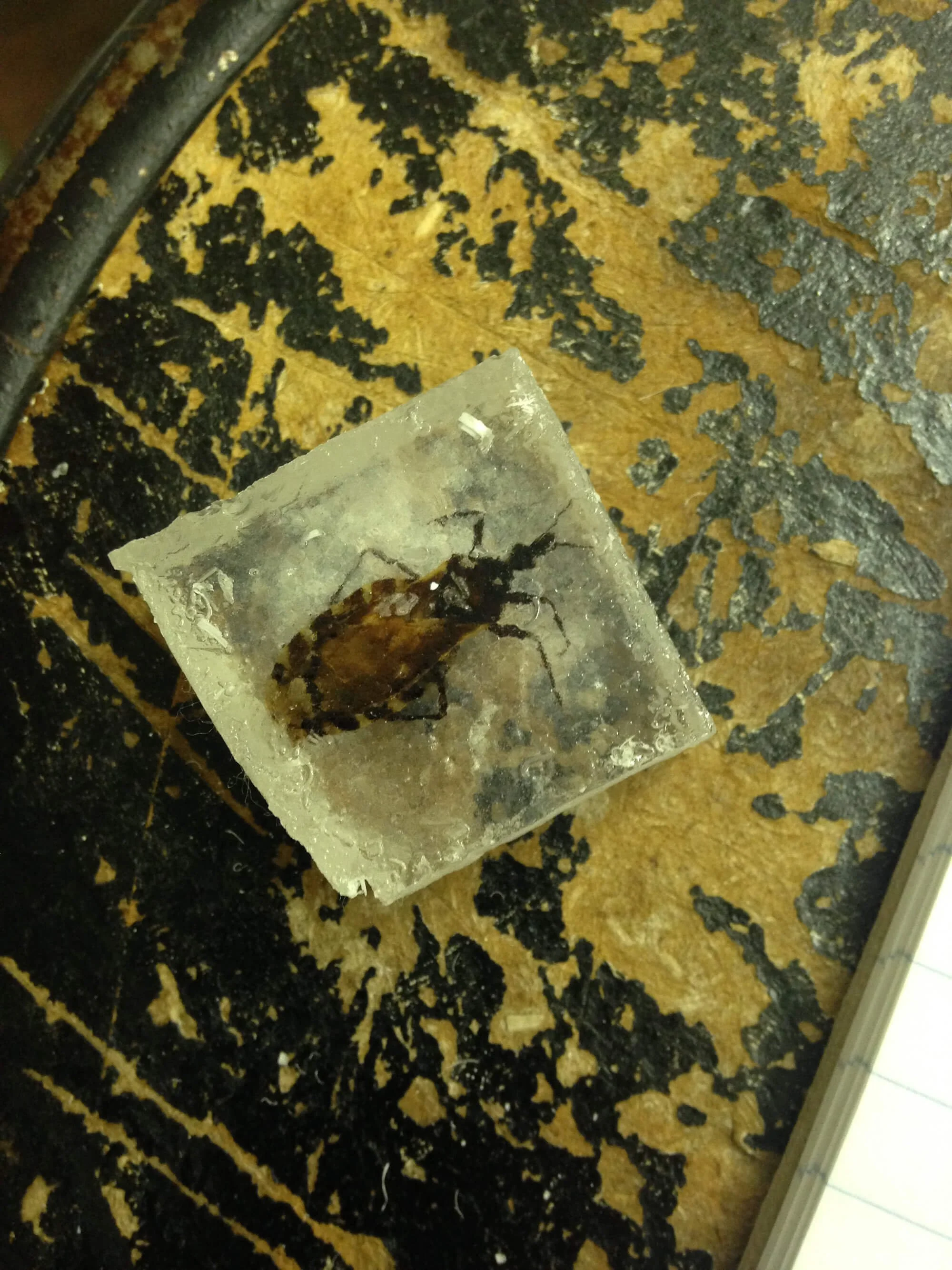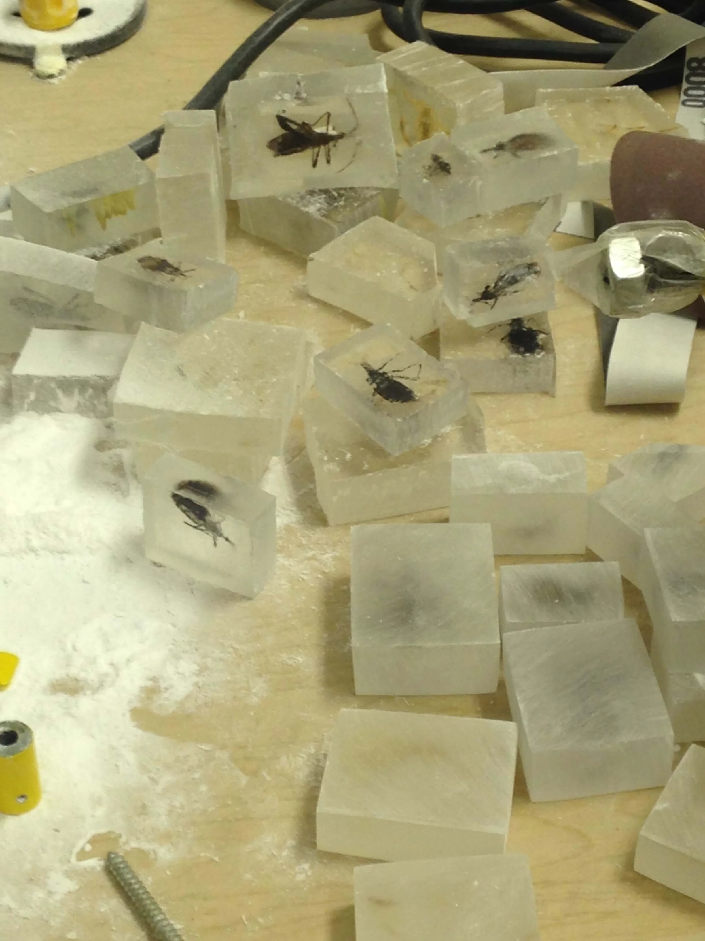 Researchers at Texas A&M University, Dr. Sarah and Gabe Hamer, placed these kissing bugs in resin for public outreach programs.
